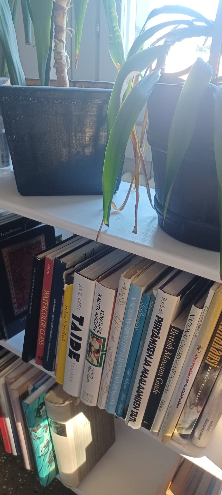 Kirjat on luokiteltu hyllyn reunassa olevien aiheiden mukaan.